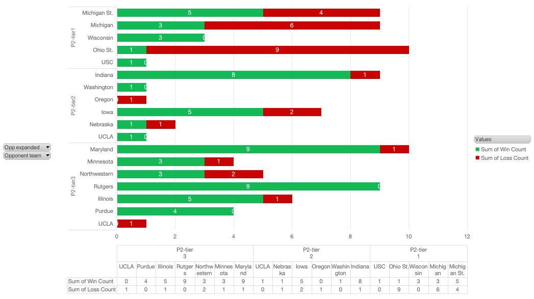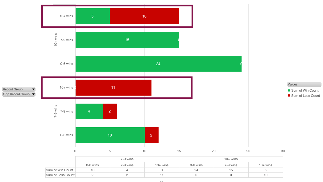 But it’s the conference games that people talk about the most. So let’s see the data from a few different angles. First we can do a comparison of quality. This is basically looking to see if PSU was a 10+ win team, how did they do against other 10+ win teams in the regular season.