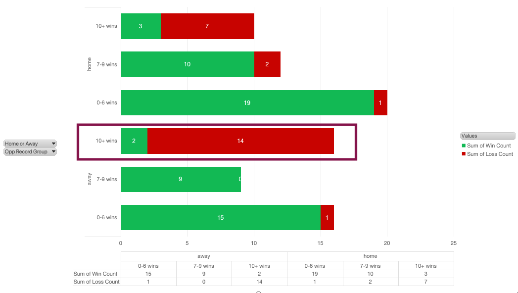 We can clearly see the two rough spots. He had 11 losses when playing as a mid-level team vs a better top-level team (based on final records). And he had 10 losses when playing as a top-level team against another top-level team. But adding location shows us that 14 of those losses were on the road against top-level teams.