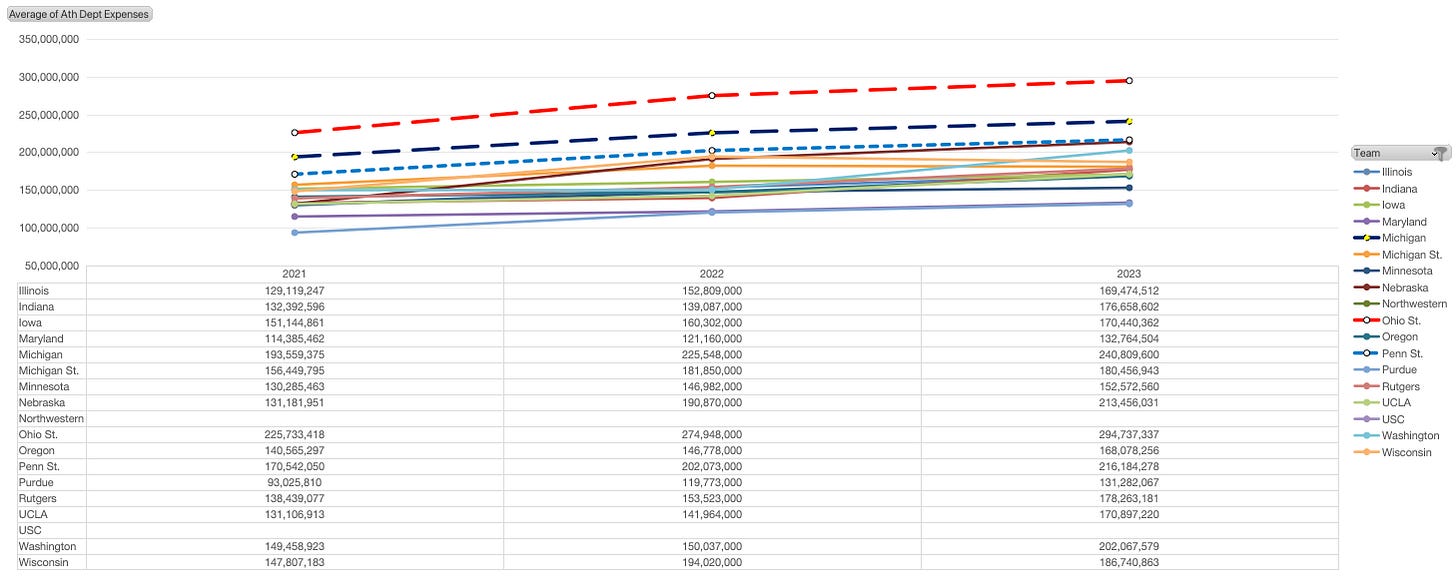 Now it’s important to put in perspective who Penn State was competing against. The most recent three years of financial data show how PSU compared in overall athletic department spending against the rest of the BIG. You can clearly see the two teams above them, Michigan and Ohio State.